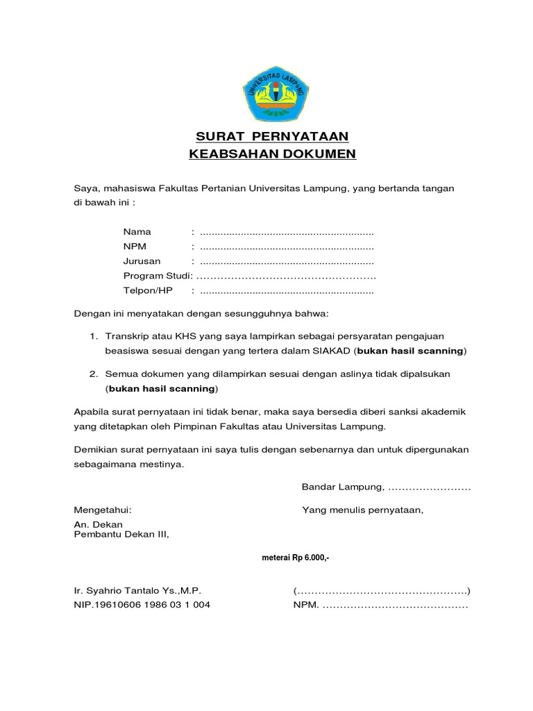 Please copy and paste this embed script to where you want to embed. Surat pernyataan keabsahan data yang diberikan dipergunakan untuk melengkapi lampiran permohonan beasiswa bantuan biaya pendidikan untuk mahasiswa program studi diploma tiga (d3) dan strata satu (s1) yang berasal dari provinsi riau. Berikut ini adalah sebuah contoh surat pernyataan kebenaran dan keabsahan dokumen lingkungan yang bisa anda jadikan bahan referensi. We are a sharing community. Copyright pemohon, (deden arfianto) surat pernyataan keabsahan dan kebenaran dokumen.